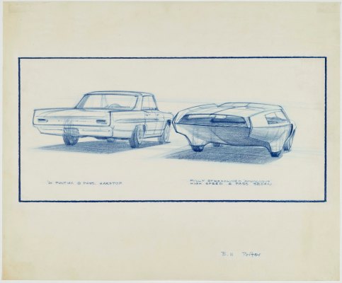 ’61 Pontiac Catalina vs. Aerodynamic Streamlined Sedan, 1959, William Porter, American; prismacolor on vellum.