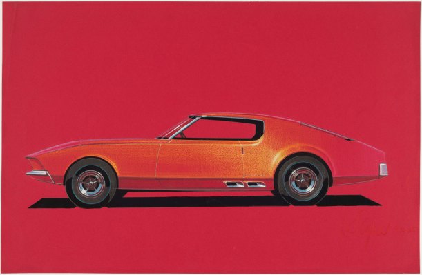 Ford Mustang, 1965, Howard Payne, American; prismacolor and gouache on red charcoal paper.