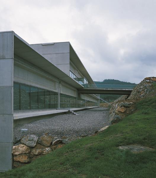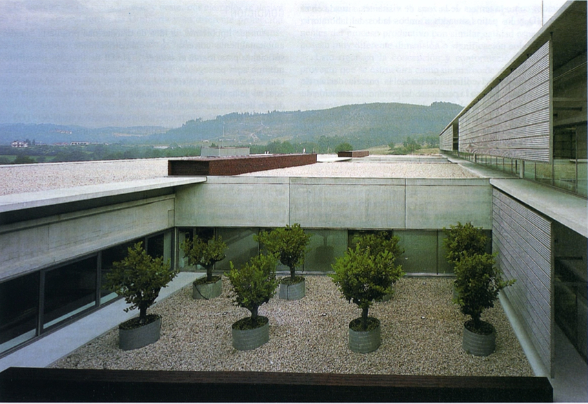 Aunque de apariencia hermética, el edificio ofrece escalas diversas según el carácter de los accesos, con una apuesta clara por la incorporación o yuxtaposición de espacios exteriores (patios y la visión lejana del paisaje del valle) al recinto de trabajo que posibilitase la transfiguración de un entorno vagamente industrial. La volumetría del edificio obedecía a una solución escalonada de bloques funcionales que, como barras deslizantes, ordenaban las conexiones funcionales y permitían amortiguar su presencia en el entorno, consiguiendo una composición horizontal adaptada con la configuración del terreno.