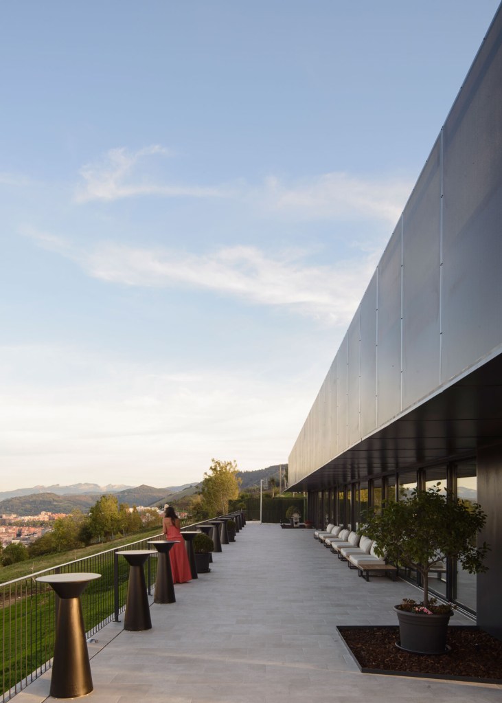 Las tres decisiones fundamentales para el cambio de uso fueron: (1) la apertura de la larga fachada Norte orientada al paisaje del Bajo Nervión para crear un gran ventanal horizontal que permite en todo momento el contacto visual y físico del interior con el exterior, disponiendo una terraza abalconada a lo largo de este costado; (2) el derribo una de las fachadas laterales para, tras girarla, crear un acceso que guía al visitante y le ofrece un espacio cubierto previo a la entrada, al tiempo que insinúa por primera vez la vista existente, y (3) el forrado de todo el volumen con un plano vertical de chapa negra microperforada, un sencillo revestimiento que proporciona un necesario cambio de imagen -contenido, pero sustancial, al permitir seguir apreciando de manera sutil el volumen original de la construcción-.