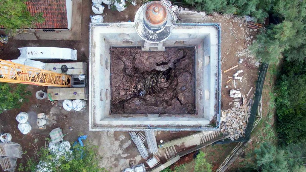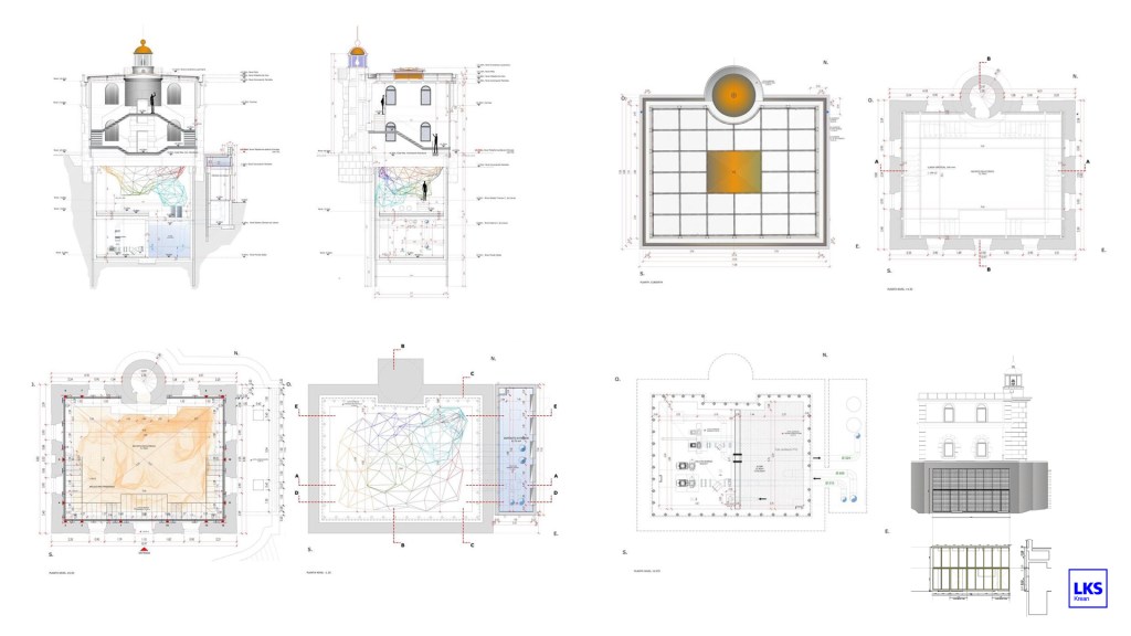 “Con el fin de generar una única sala para la visita pública se ha vaciado el interior partiendo de la cota 0, de hasta 10 m de profundidad para alojar la escultura en un primer nivel y estancias técnicas en el nivel más profundo. El vaciado y sostenimiento de los empujes del terreno y la preservación del perímetro de la edificación sin afección a la preexistencia ha supuesto un gran reto. La cubierta es muy plana y ligera, a dos aguas, con una cúpula central a cuatro aguas, de cobre (como la coronación de la torre del faro) y rodeada perimetralmente por una piel de vidrio fotovoltaico transparente, compuesta por 30 paneles, que además de generar la energía para el funcionamiento diario del edificio y de la señal marítima, filtra la entrada de calor al interior”.