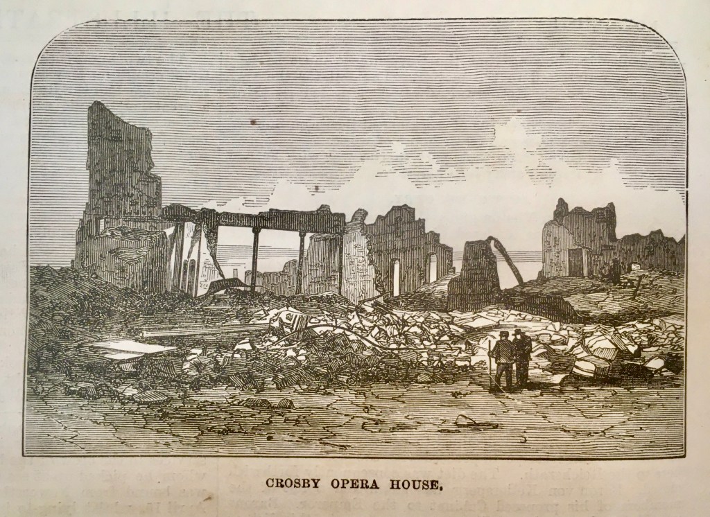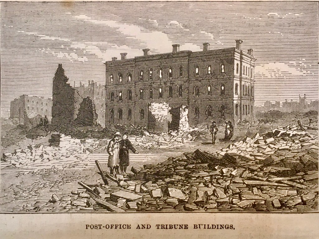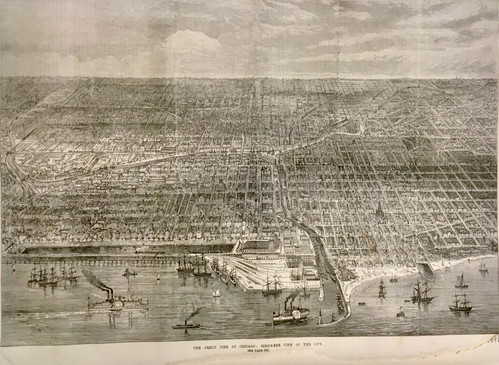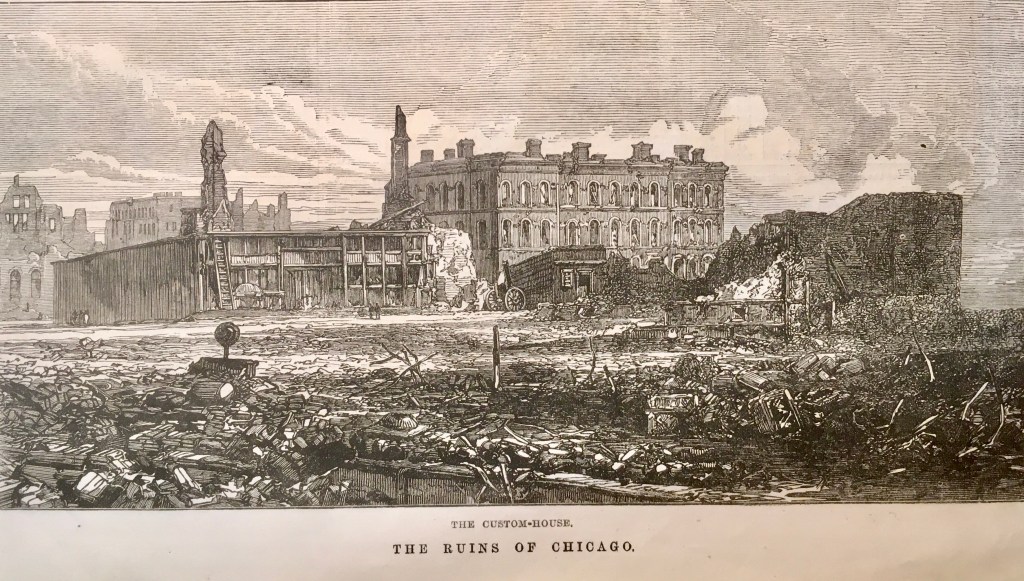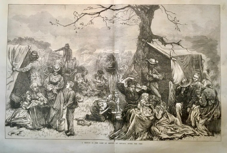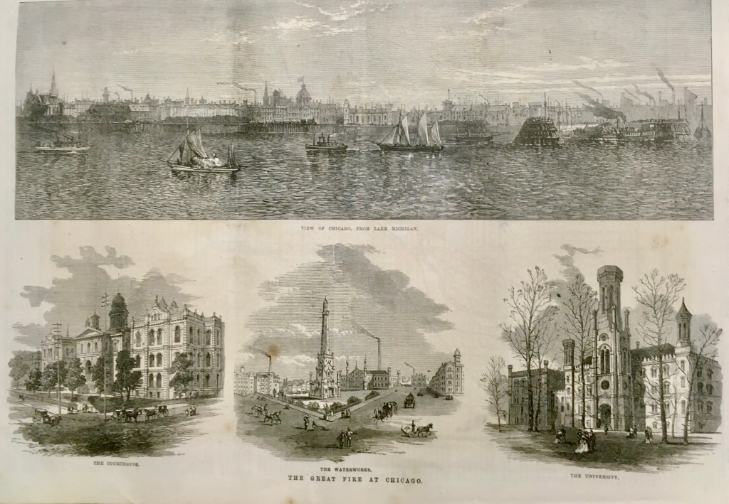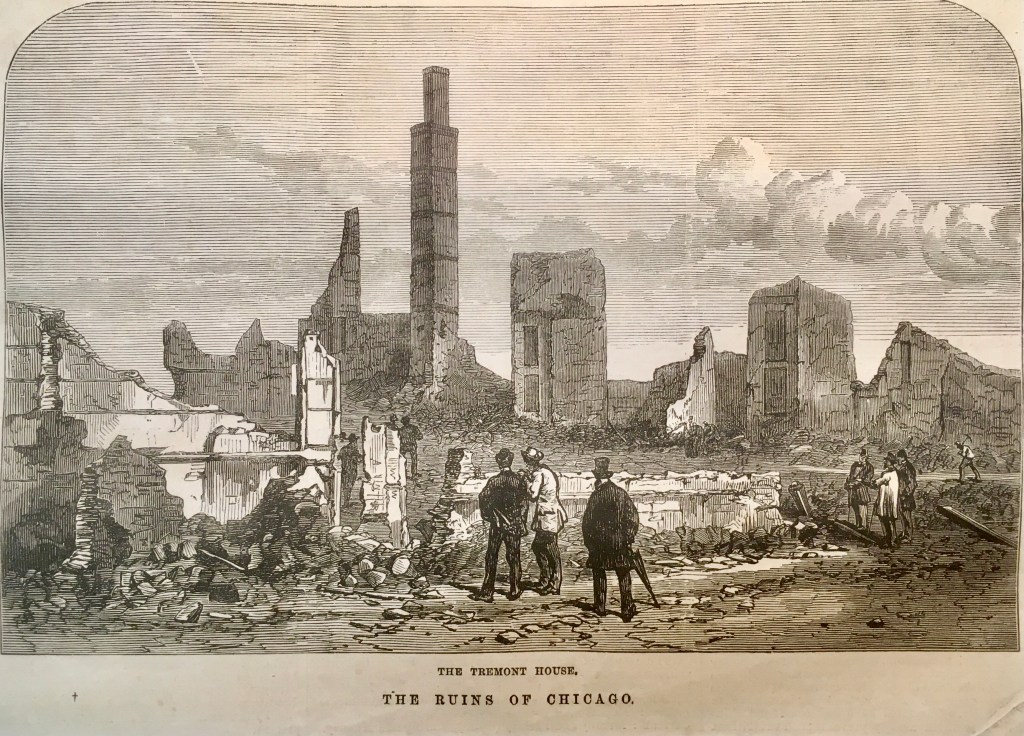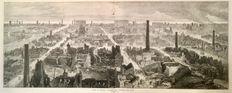 Traigo este recuerdo aquí porque, debido a una circunstancia fortuita, tengo en mis manos la colección completa del semanario londinense The Illustrated London News del año 1871 y me ha parecido curioso el conjunto de grabados con el que el periódico informó a sus lectores del dramático suceso norteamericano a lo largo de los meses de octubre y noviembre. Estos grabados estaban acompañados, naturalmente, por informaciones escritas que permitían entender mejor y con mayor detalle lo que las imágenes mostraban. Algunos ofrecían aspectos de cómo había sido la ciudad antes de su destrucción, otros la presentaban como una suma de ruinas desperdigadas, sin que faltasen algunos más en los que la población afectada (uno de cada tres ciudadanos perdió su vivienda) mostraba su desamparo y fueron muchos miles de personas, pues la ciudad había tenido un crecimiento acelerado en muy poco tiempo, alcanzando los 300.000 habitantes en 1870.