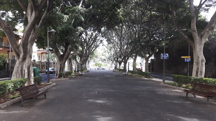 La pieza (arquitectura + plaza) se halla inserta en una larga y elevada muralla de edificios que separa, a un lado, el paseo de la Rambla con su tupida fronda y, al otro lado, la ladera de un barranco próximo. La hilera continua de edificios impide ver la montaña situada tras ellos y el paseante primerizo, atraído por las espectaculares ramas de los laureles de Indias sobre su cabeza, no siente que el continuo lateral edificado le esté arrebatando nada. Se deja llevar, pero de pronto la muralla de viviendas se abre en una plaza, mostrando a un costado el Colegio de Arquitectos y al frente, ante la montaña súbitamente descubierta, una escultura de Martín Chirino, Lady Tenerife. La sensación que nota el paseante en ese punto es la de que bajo los árboles centenarios ha estado caminando por una arteria vegetal o umbráculo protector y que, inesperadamente, el paseo se ha abierto, con generosidad, en un costado hacia el soleado paisaje natural, descubriéndolo como regalo en forma de espacio urbano, arquitectónico, artístico y paisajístico de una calidad suprema. La generosidad se advierte de inmediato, pues el edificio renuncia a ocupar en altura toda la parcela que le pertenece para posibilitar la aparición luminosa de la ladera cubierta por un colorido manto vegetal de tabaibas, pitas y tarajales. Tal renuncia, sin embargo, no impide que bajo la plaza se disponga de una preciosa sala de exposiciones anexa a la sede colegial. Es mucha la inteligencia aplicada a este lugar.