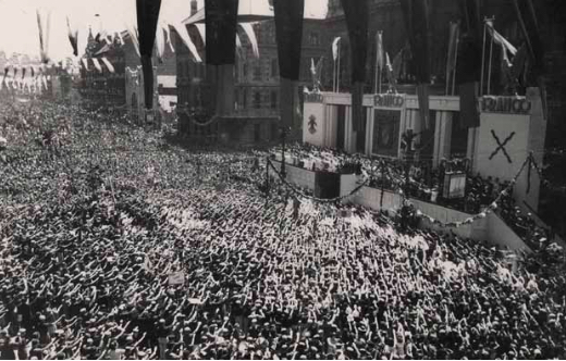 Una amplia tribuna erigida ante la Diputación, desbordante de autoridades, respaldada por el escudo de España con el águila imperial, flanqueada por los símbolos del carlismo y la falange, permitía dirigirse a una multitud de personas que saludaban con el brazo en alto. Toda la grandiosidad quedaba aquí limitada a las cuatro parejas de postizas columnas a ambos lados del escudo franquista, al flamear de banderolas colgantes y al vociferante FRANCO, FRANCO, FRANCO. La falta de un gran espacio urbano despejado ante la institución provincial impedía la toma de imágenes en las que la totalidad de gentes concentradas pudiera ser fotografiada, algo que los nazis sabían muy bien cómo hacer.