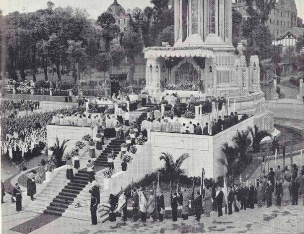 La escenografía efímera de la exposición del Auxilio Social celebrada en el patio del Instituto Central, en 1942, estuvo construida con una grandilocuencia de cartón-piedra, una avenida ceremonial sin asfaltar e iconografía de bajo vuelo, en pobre imitación de los grandes avenidas para desfiles en Berlín.