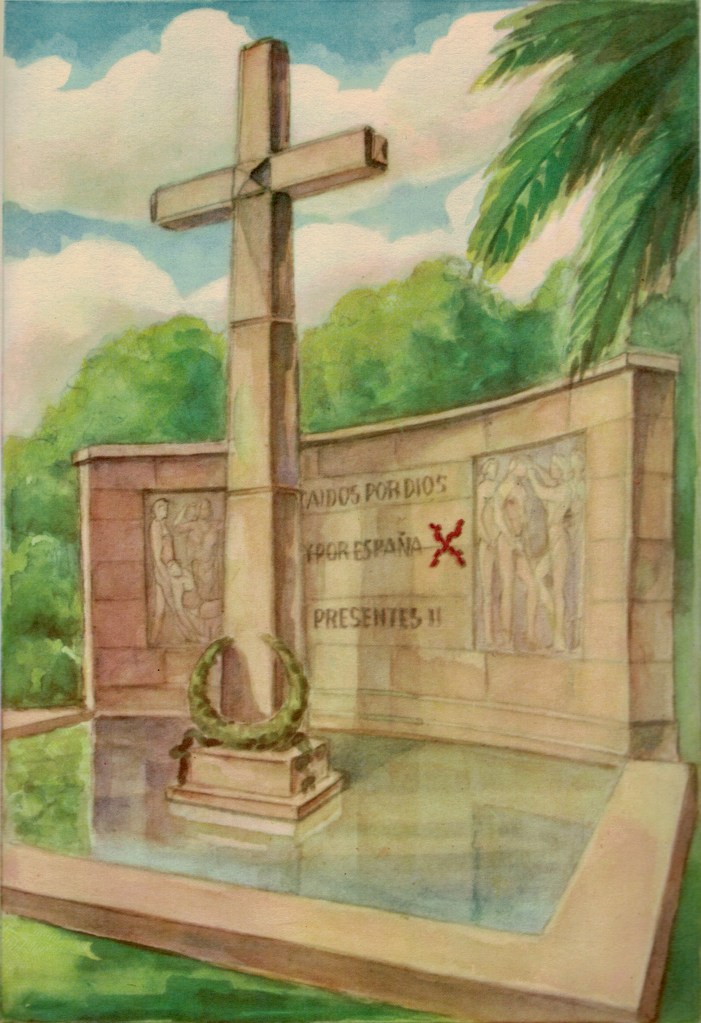 «Este tipo de monumentos, militante y propagandista, exaltó la ideología de los triunfadores y evocó simbólicamente a los ausentes en sus dos formas fundamentales: los héroes y los mártires. Su muerte se reelaboró en términos de un justo sacrificio que los ennoblecía y elevaba a una dimensión sobrehumana de heroísmo: de muertos pasaron a ser caídos. La memoria a rendir a los muertos de la llamada España nacional o a los muertos en los bandos contendientes exaltaba el gusto necrofílico del régimen y reforzaba sus fines propagandísticos y laudatorios» (copio este párrafo perfecto de un texto de Mónica Vázquez Astorga).