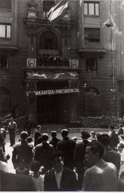 El 20 de junio de 1937 las tropas ocupantes de Bilbao descuelgan de la fachada del hotel Carlton el letrero de la Lehendakaritza que estuvo situado en el balcón-tribuna ante el despacho de José Antonio Aguirre. Las ventanas de la planta baja, así como las rampas de acceso a la puerta, aparecen protegidas por sacos terreros. Al fondo y a la izquierda un soldado controla que la gente que observa la acción no se acerque demasiado al hotel. Esa gente, de pie, quieta y vista de espaldas, asiste pasivamente al hecho. Alguno, sin embargo, ha dado la vuelta y se marcha para no verlo.