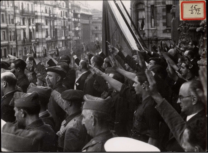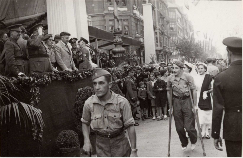 Saludos a soldados insurrectos mutilados en acciones de guerra ante tribuna ocupada por militares que ostentan el brazalete con la esvástica nazi, el domingo 18 de septiembre de 1938. El militar español que saluda era el general Luis Orgaz, consejero nacional de la FET y las JONS. El civil ataviado con boina era Luis Llaguno Piñera, presidente de la Diputación de Vizcaya.