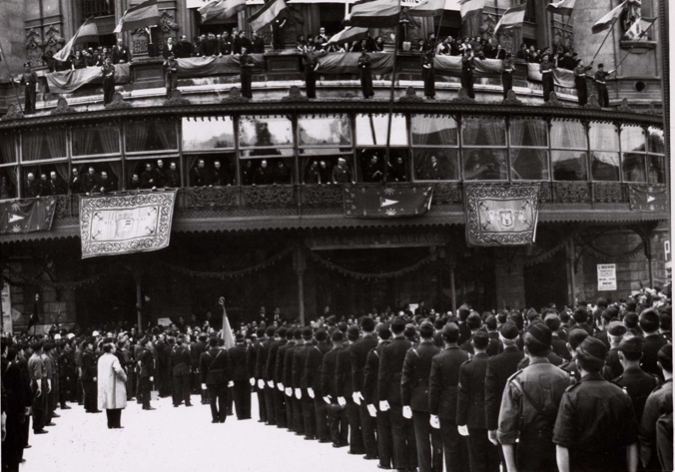 Las personas que estaban en el balcón-tribuna de la Diputación el 1 de octubre de 1937 saludan brazo en alto. Son militares, requetés, falangistas y civiles. Algún civil, con cara circunspecta, no levanta su brazo.