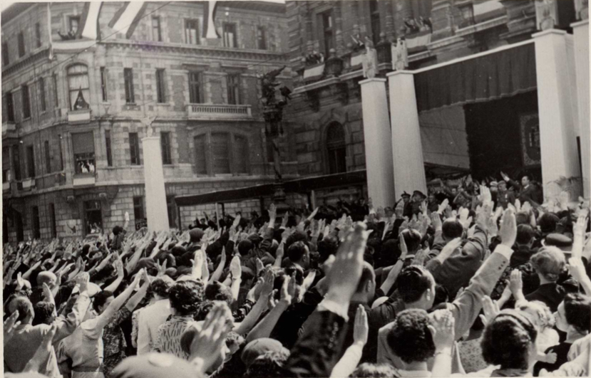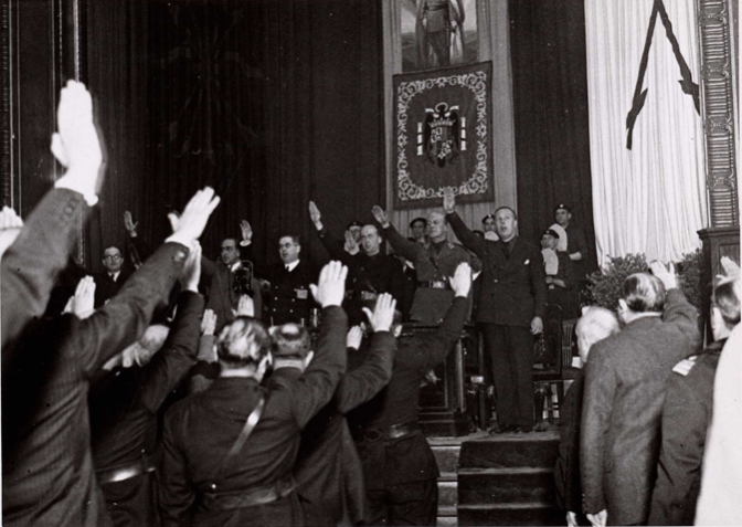 Publico en la calle y autoridades en la tribuna se saludan brazo en alto, el 18 de septiembre de 1938. El águila falangista que coronaba los pilares blancos de adorno para la tribuna estaba inspirada directamente en el águila nazi.