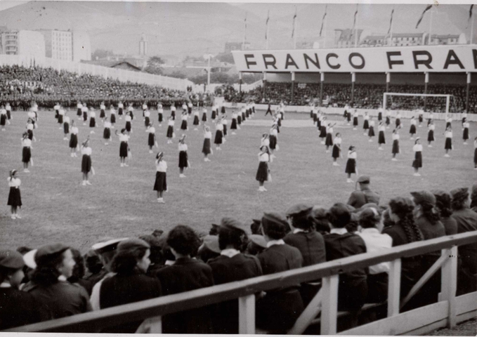 Congreso nacional de los Servicios Técnicos de la FET y las JONS en el paraninfo del Instituto Central de Bilbao. Un retrato al óleo de Franco, realizado a partir de la fotografía que se le hizo en 1930 vestido con capa invernal y cuello amplio de piel, visto parcialmente, preside el lugar por encima del tapiz con el escudo y el águila. Desconozco la autoría de ese retrato (¿Ángel Larroque?), pero creo que ocupa el mismo lugar que anteriormente había tenido el retrato de Alfonso XIII pintado por Aurelio Arteta. Recuerdo haber visto este retrato hace años, retirado en un almacén de la Casa de Juntas de Gernika.