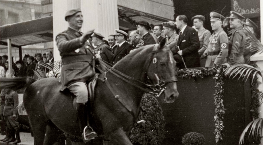 Fiesta del Caudillo, 1 de octubre de 1937. En el balcón-tribuna de la Diputación, la derecha, se reconoce perfectamente la bandera con la esvástica nazi y, a la izquierda, la enseña italiana del Corpo di Truppe Volontarie (CVT), una fuerza de combate del ejército de tierra. Las banderas de los aliados de Franco ostentaron un lugar más preeminente que las enseñas locales, situadas a los lados.