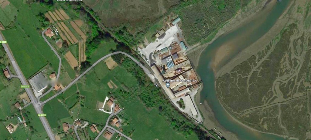 Astillero de Murueta, instalaciones sin actividad actualmente y vista aérea del lugar.
