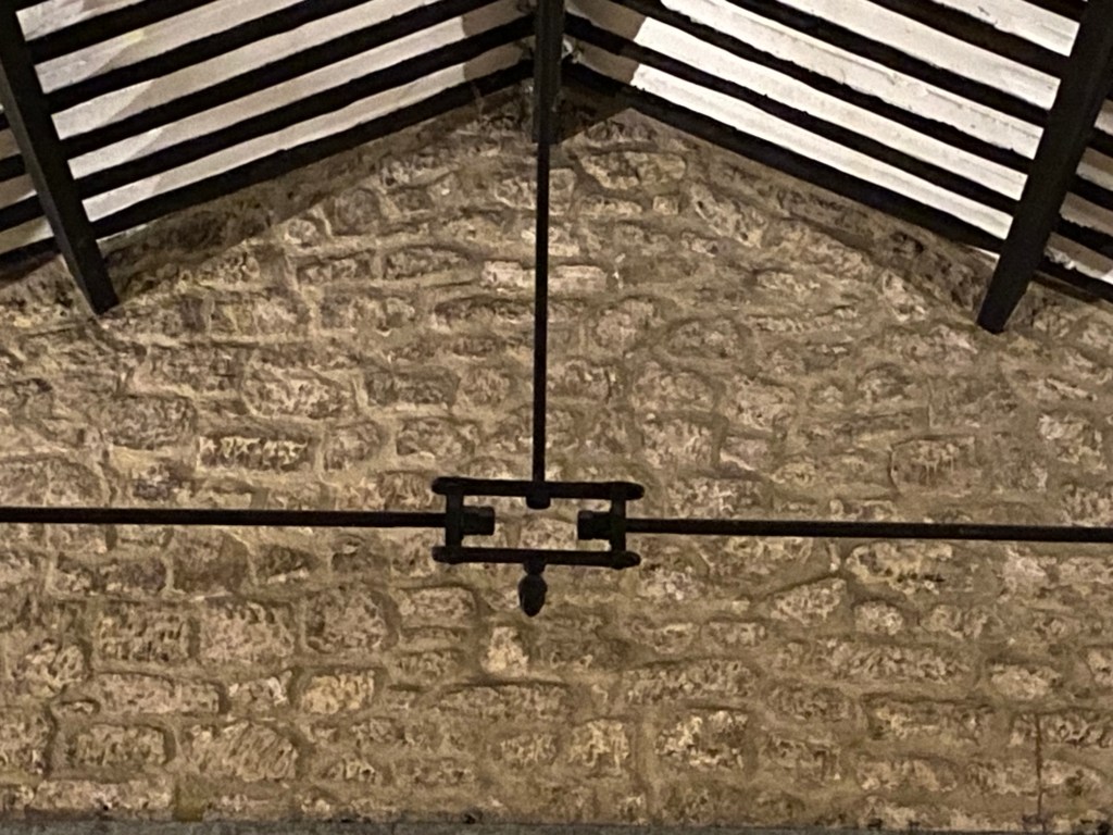 El asunto es más sofisticado de lo que pueda parecer un simple híbrido de diferentes modelos de cerchas, pues el encuentro entre las barras se lleva a cabo mediante diferentes sistemas de articulación. El elemento clave y original es una pieza rectangular abierta en su interior que une el tirante con el pendolón. El tirante está partido, pero unido a esta pieza a derecha e izquierda. El carácter mestizo de este trabajo se manifiesta también en el hecho de que, si bien la parte sustancial de la cercha es metálica, sin embargo, son de madera los pares adosados a la cubierta, a los cuales se anclan los tornapuntas metálicos. Los extremos del tirante se hunden en los muros de piedra junto a los arranques de las vigas de madera tras sortear estas mediante abrazaderas . La utilización de delgadas barras de hierro de sección circular posibilita una espacialidad mucho más diáfana y aérea de la que hubiese sido posible lograr con gruesas vigas de madera de sección cuadrada.