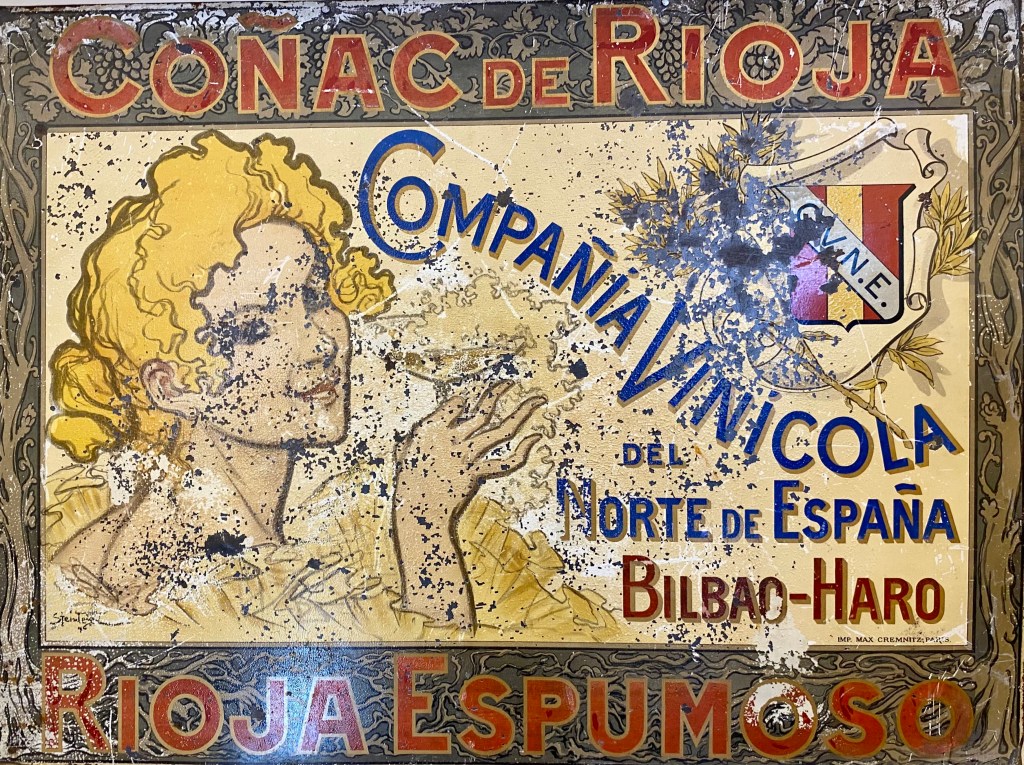 Relacionado con aquel París fin-de-siècle, encontré en el interesante conjunto de diplomas ganados y publicidades encargadas por la bodega, una placa metálica con la que se anunciaba el coñac y el espumoso elaborados entonces por CVNE. Muestra el dibujo a color de la cabeza de una joven rubia, copa en mano, y que, girando su cuello y sonriente, mira al observador. Para mi sorpresa, este dibujo está firmado por Théophile Alexandre Steinlen en 1897. Steinlen fue una figura muy característica del Montmartre bohemio, ligado a los artistas de Le Chat Noir. Era un militante socialista que, en paralelo a alegres muchachas para publicaciones como L’Assiete au Beurre y Le Rire, dibujaba la vida dura y sufriente del proletariado de la época. La revista La Lucha de Clases, órgano portavoz del socialismo bilbaíno, solía incluir sus dibujos, tomados de otras revistas, sobre todo Le Chambard socialiste, para ilustrar sus páginas. Resulta curioso que los hermanos Real de Asúa contratasen los servicios de Steinlen, pues ellos pertenecían a la clase burguesa a la que el dibujante dirigía sus dardos.