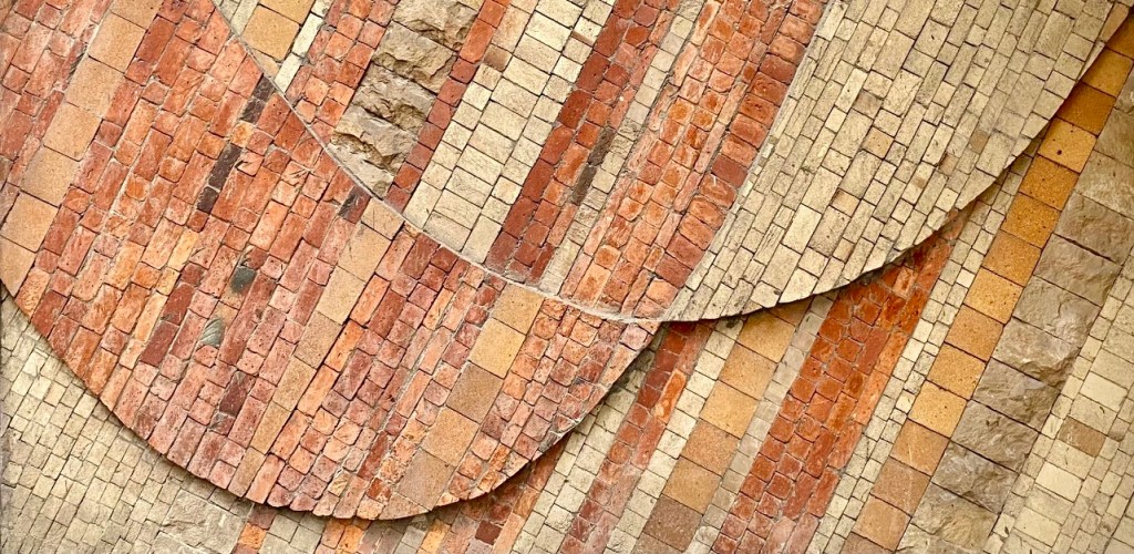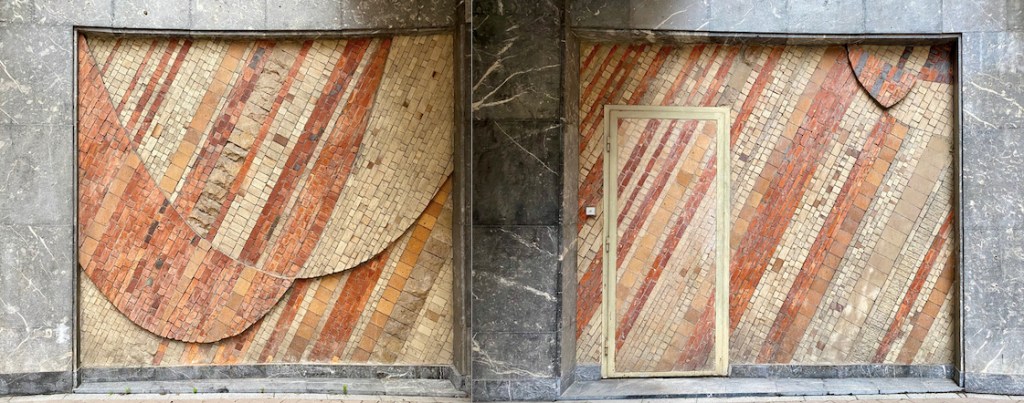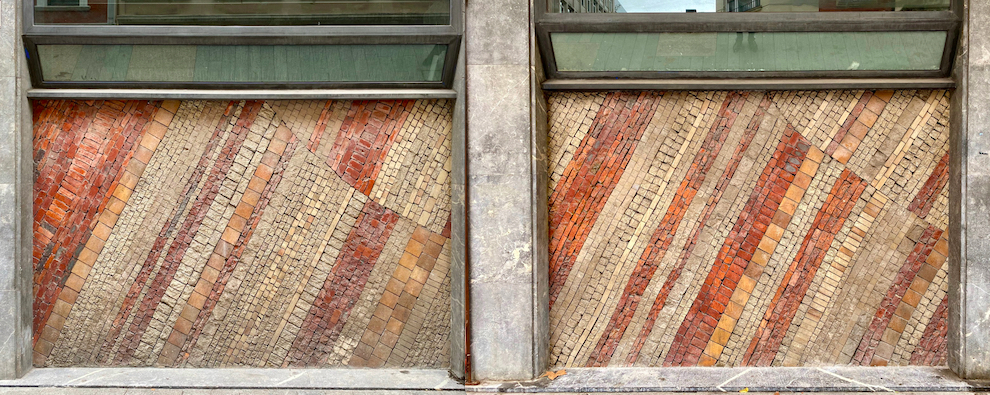 Apenas unos pocos días después de lo anterior, algo similar ha sucedido en Bilbao. Por razones personales paso por delante del edificio 6-8-10-12 de la calle Iparraguirre todos los días. Durante varias décadas los cierres entre pilares de la fachada en planta baja han sido unos sorprendentes y artísticos murales elaborados con diferentes tipos de adoquines y ladrillos, como teselas, configurando composiciones, a la manera de mosaicos, que han dado un aspecto extrañamente moderno y sofisticado a ese largo tramo de la calle que antes del nacimiento del Guggenheim Bilbao Museoa era una zona poco frecuentada excepto por los vecinos residentes en ella. A modo de estratificaciones geológicas, flysch, múltiples capas de materiales cerámicos, diferentes en forma, grosor y color, con desarrollo diagonal, han proporcionado un insólito y silencioso espectáculo de calidad urbana.