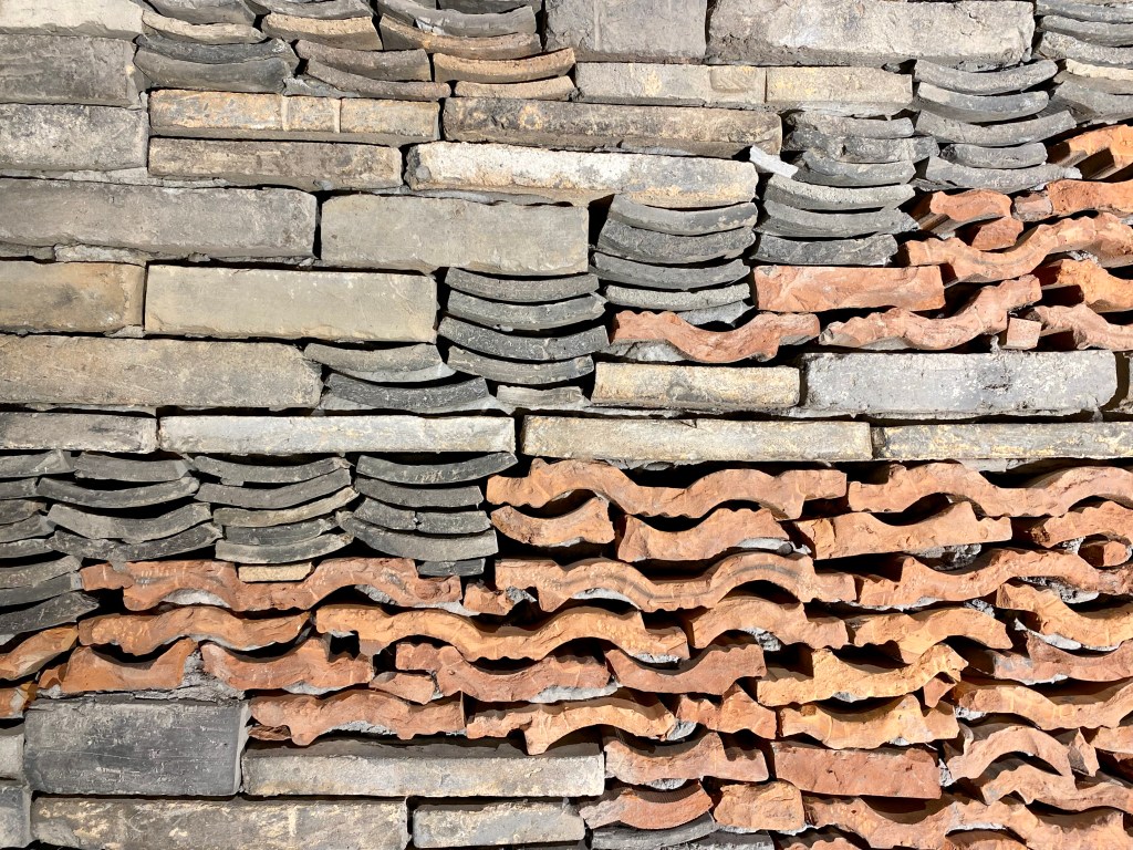 Fragmento de muro en el Museo de Historia de la Ciudad de Ningbo en el que aprecia la doble textura que caracteriza su aspecto exterior, abajo con fragmentos de ladrillos, tejas y adoquines reutilizados, y arriba con hormigón encofrado entre gruesas cañas de bambú.
