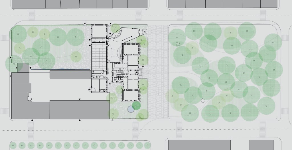 Planta de los antiguos edificios escolares, reformados, con la inserción de la Torre de Luz.