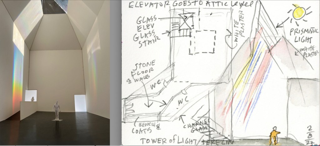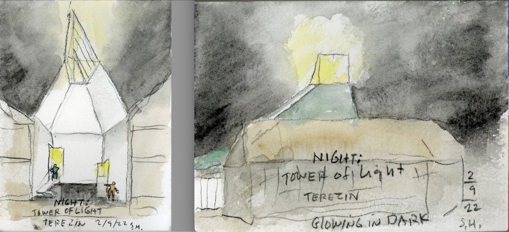 A diferencia del Monumento a los judíos de Europa asesinados, diseñado para Berlín por el arquitecto Peter Eisenman y el ingeniero Buro Happold (2003-04), que remite a la imagen abstracta de un laberinto conformado por 2711 losas de hormigón, o del desasosegante Museo Judío de Berlín, del arquitecto Daniel Libeskind, con su planta en forma de rayo (1999), el diseño de dicha Torre de Luz para un museo de dimensiones mucho más modestas que sus hermanos berlineses se inspiró en el icónico dibujo llamado «Paisaje lunar» realizado por Petr Ginz, niño judío prisionero aquí. Ginz había nacido en Praga el 1 de febrero de 1928, fue deportado a este campo de concentración, donde realizó el imaginativo dibujo de una vista de la Tierra desde la Luna. En 1944, Ginz fue deportado a Auschwitz y asesinado con gas a la edad de dieciséis años. Es decir, una parte del sufrimiento, la esperanza y el deseo de escapar del horror sentido por un niño-preso en ese lugar y trasladado a un dibujo sirvió para dar forma a un museo en donde se rememora la totalidad del dolor allí vivido y las muertes ocasionadas. El dibujo muestra un conjunto de seis agrestes montañas coronadas con tres erizados picos cada una e iluminadas por la luz procedente de la Tierra, la cual actúa como la Luna lo hace para ésta, al ofrecer una claridad rodeada de tinieblas.