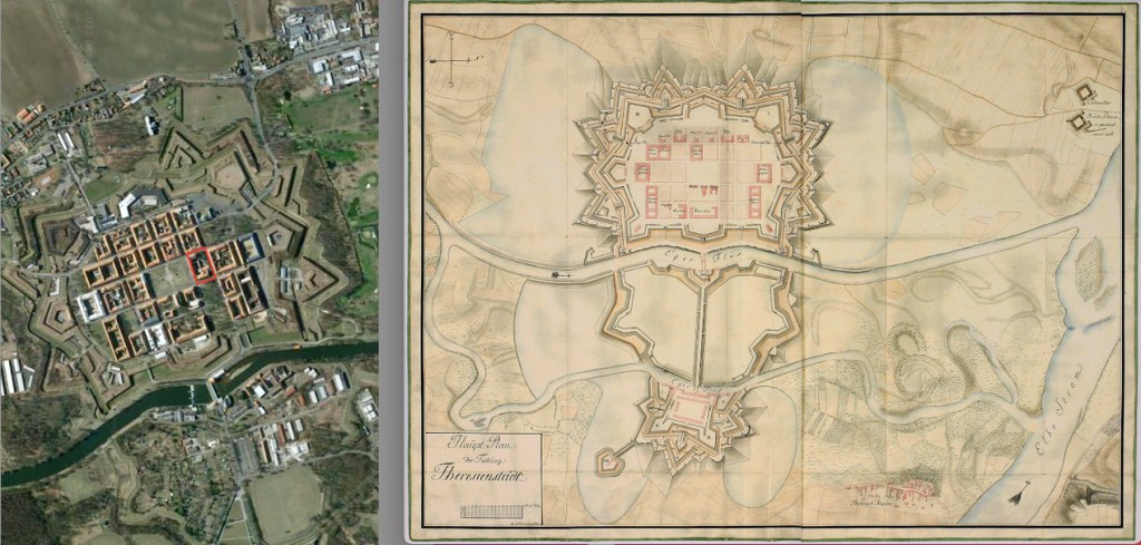 Ciudad-fortaleza de Terezín, vista aérea actual. Plano (1790) de la ciudad (arriba) con su fortaleza (abajo). El cuartel de la Gestapo estuvo en la fortaleza, el museo se ubica en el centro de la ciudad (recuadrado en rojo en la foto).