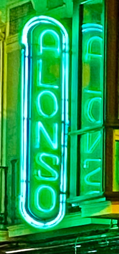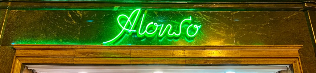 Ante la casa de mis padres, donde nací y viví casi tres décadas, había una secuencia de locales comerciales cuya imagen recuerdo vivamente. Justo frente al portal estaba Andéchaga, que se dedicaba a la venta de lámparas y suplementos eléctricos, su letrero era un gran luminoso de neón -no podía ser de otra manera-, separado de la fachada y sobre una pequeña marquesina, que reproducía el nombre caligráficamente a modo de firma rubricada. A su derecha se encontraba Mota, que vendía ferretería en general y en un recuadro sobre la puerta de acceso mostraba su nombre en relieve con letras minúsculas de paloseco, muy estiradas, de color marrón sobre un fondo negro. A su derecha, Ortiz, ultramarinos cuyo nombre, encima de la entrada, aparecía con letras mayúsculas, individualizadas y muy altas, confeccionadas en latón plateado que mostraban en su mitad derecha unos pequeños bajorrelieves de estrías en zig-zag vertical, mientas la mitad izquierda se mostraba lisa (detrás tenía una vidriera que reventó por la onda expansiva de una bomba que puso ETA en las cercanías), todo ello muy art-decó. A su derecha, existía un local dedicado a la venta de sábanas y lencería, Manzanos, cuyos rótulos mostraban letras geométricas de color verde con finos ribetes dorados sobre cristal negro. A su derecha, ya al otro lado de la calle, la preciosa zapatería Alonso, único local que continúa activo en perfectas condiciones desde 1940, con dos neones verdes diferentes cuyas imágenes se pueden ver aquí arriba.