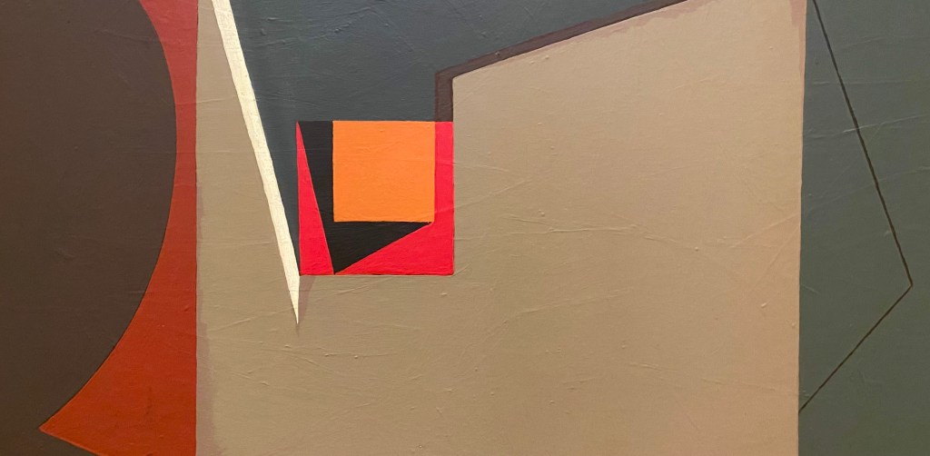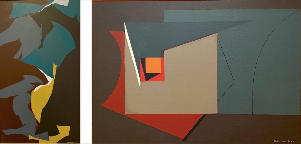 Interactividad vertical, 1957, acrl/tblx, 122’5×70 cm. ———- Composición desde el cubo, 1957 acrl/tblx, 90×130 cm.