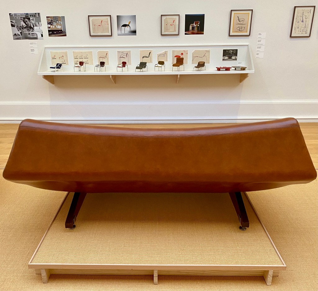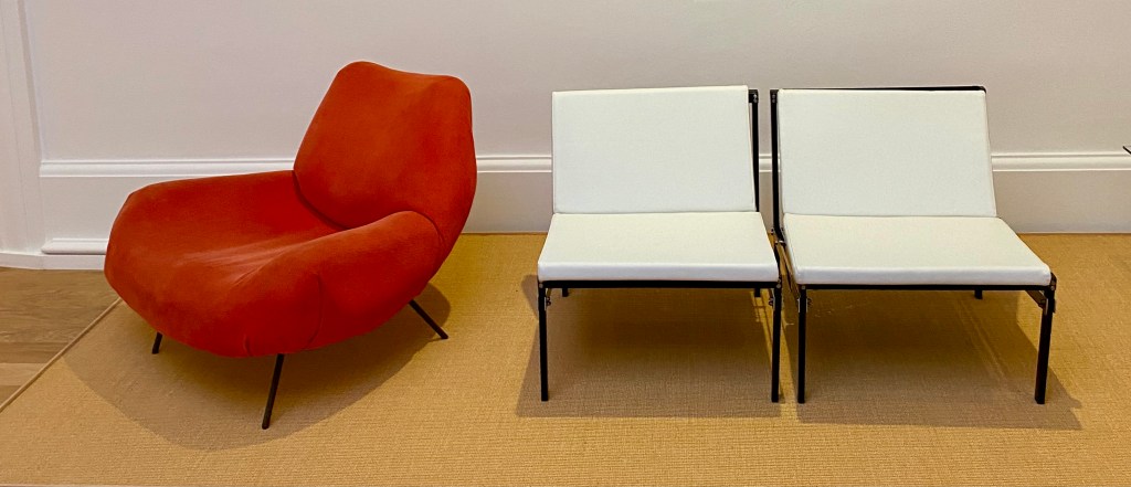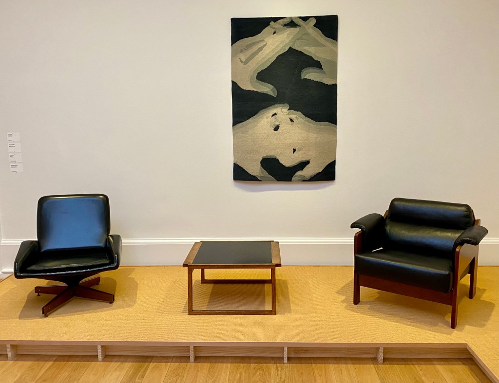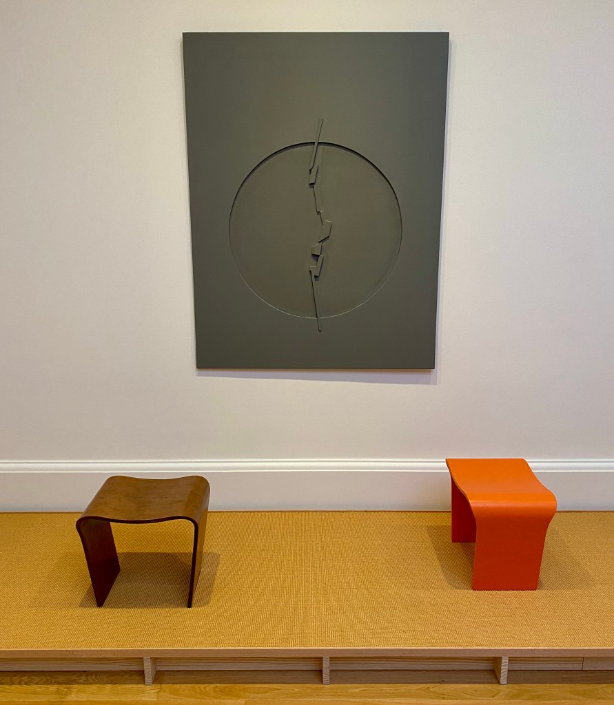 En todo caso, en 1960 Basterretxea estaba centrado en los muros-relieve y no parecía pensar aún en mobiliario. Quienes sí lo estaban desde el año anterior eran sus colegas de Equipo 57, cuya estrecha cercanía se manifiesta en una pintura realizada por Basterretxea (arriba a la izquierda) presente en la exposición. Equipo 57 colaboraba con la casa DARRO, fundada en Madrid en 1958, con diversas propuestas de mobiliario, pues diseñaron una cama, una butaca, un sofá, una silla, una bancada, un taburete, una mesa, unas literas y un aparador, modelos completamente desmontables y de fácil montaje a los que también Basterretxea prestaría atención poco tiempo después.