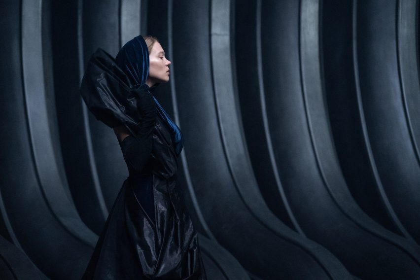 Pasadizo diseñado a la manera de una fosa séptica de plástico junto a la elegante indumentaria de la mujer, unificadas por el color negro. En esta imagen la actriz Rebecca Fergusson lleva un vestido de aspecto muy Balenciaga. Las fosas sépticas son un punto de partida muy poco adaptable al lenguaje arquitectónico, pero es un buen ejemplo de cómo la imaginación puede producir resultados originales.