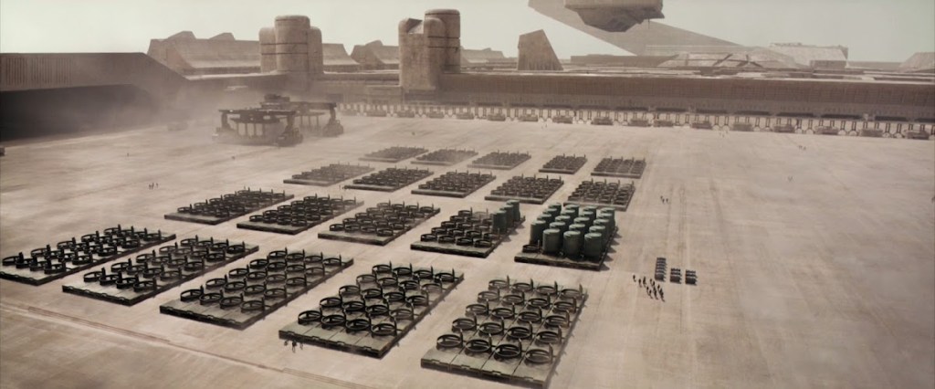 En la segunda parte de la película -aún no la he visto- las escenas exteriores están filmadas con una cámara de infrarrojos de alta intensidad, lo que da como resultado una imagen de gran contraste en blanco y negro, que acentúa la piel pálida y delgada de las personas y vuelve a enfatizar la opresión de su entorno. Uno de los escenarios memorables, el campo de batalla, hace alusión a las estructuras de la antigua Roma. La única ubicación del mundo real utilizada para la arquitectura de la película ha sido la famosa, pero rara vez vista, Tumba de Brion, de Carlo Scarpa (San Vito d’Altivole, cerca de Treviso, Italia), aunque los trabajos de este arquitecto veneciano ya habían sido utilizados como inspiración para los escenarios de la primera película.
