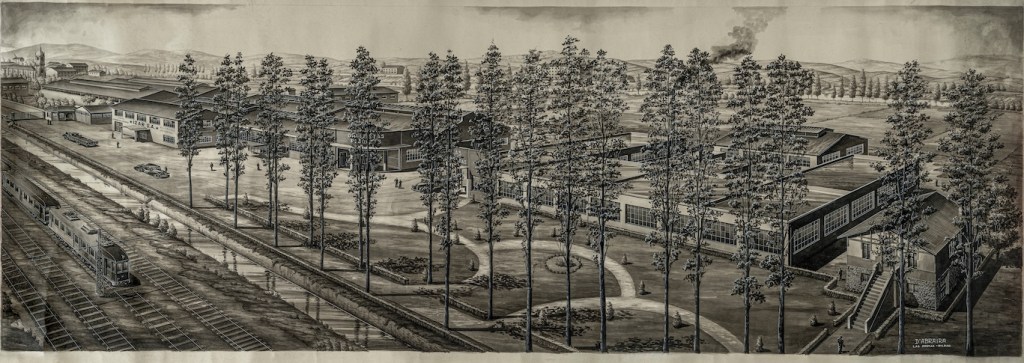 Detalle en el dibujo para Franco Española de Cables y Alambres (Erandio, Bizkaia), tinta, acuarela y guache sobre papel, 62×191 cm.
