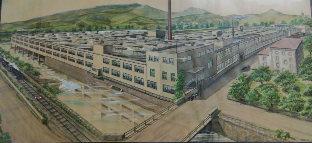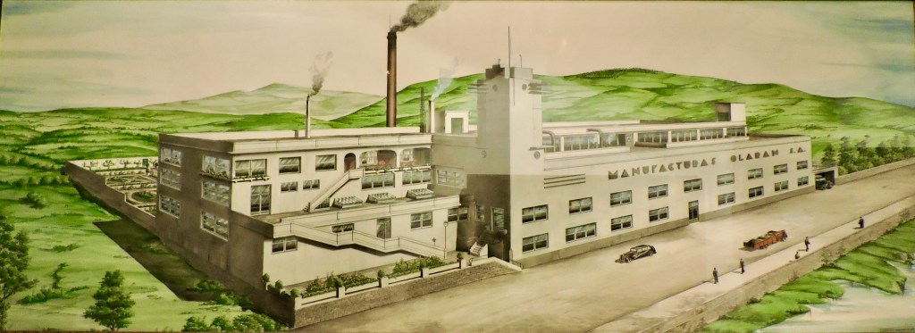 Manufacturas Olaran (Beasain, Gipuzkoa), tinta, acuarela y guache sobre papel, 88×238 cm.- Construido en 1939 con fuertes señas de modernidad racionalista, en sus inicios se centró en los curtidos, pero evolucionó, innovando y modificando sus especialidades: planchas de caucho para calzado, curtidos de cuero vacuno para la industria de muebles, marroquinería e hidrofugación del cuero destinado a tapicería. Continuó en funcionamiento hasta en 2009. Sólo se conserva el pabellón frontal a la calle, el resto se derribó para construir viviendas.