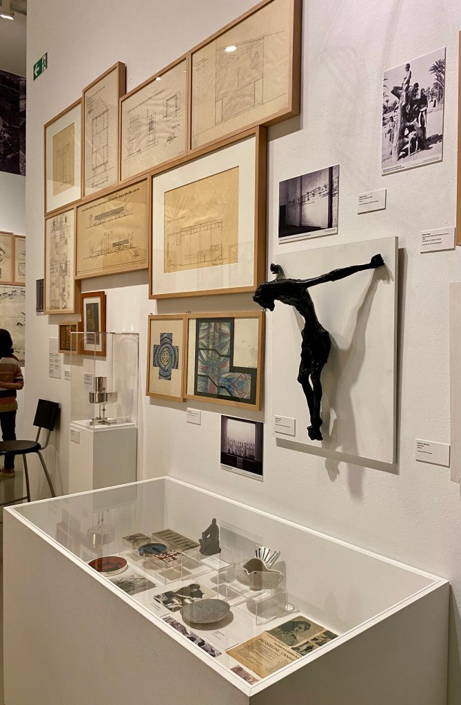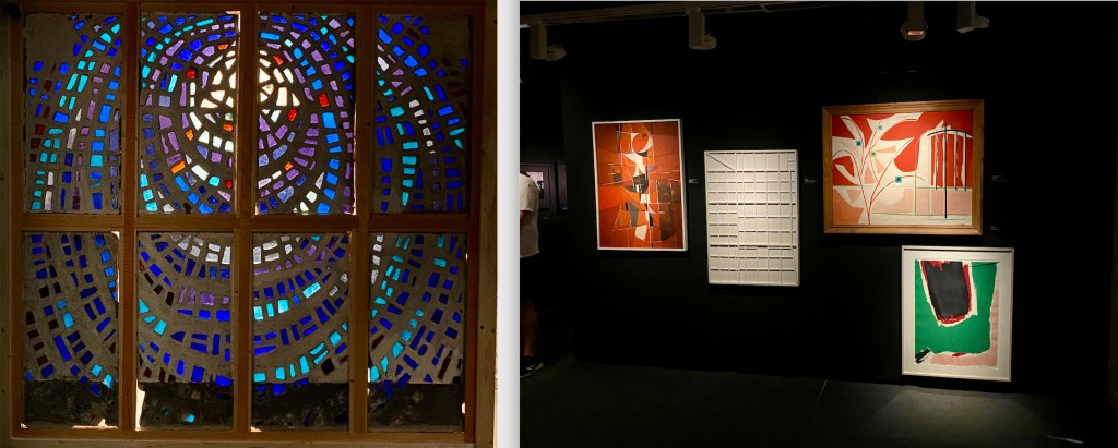 La siguiente sección es la dedicada al arte y los artistas. La principal dificultad expositiva aquí radica en que la mayor parte de estas obras están unidas a lo arquitectónico, de modo que pinturas, esculturas, relieves, mosaicos, vidrieras, algunos viacrucis… se hallan en ábsides, presbiterios, fachadas, altares, suelos, muros laterales…, no siendo posible -o siéndolo de manera compleja y costosa- desprenderlos de dónde se encuentran. Así que lo religioso-artístico se reduce a exponer objetos pequeños (cálices, sagrarios, cuencos, jarras, cajas…), bocetos o dibujos preparatorios y reproducciones fotográficas de las grandes piezas. Esta parte de la exposición se queda corta, pues el patrimonio existente en esas iglesias es espectacular y tuvo una importancia trascendental para una generación de artistas modernos a los que este trabajo alimenticio (que a menudo no firmaron por no sentirse identificados en lo político ni en lo religioso) les permitió vivir para realizar, en paralelo, las obras artísticas que sí les interesaban. El montaje de estas piezas, tipo gabinete, tampoco permite que lo poco que hay luzca como debería.