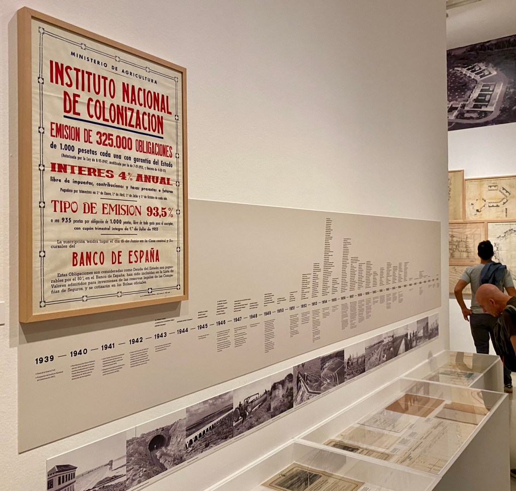 Línea del tiempo con indicación de los poblados inaugurados en cada año. Sobre ella y al comienzo, cartel de 1955 que anuncia la emisión de obligaciones del Estado para financiar las actividades del INC. En la vitrina, documentos originales relativos a la puesta en marcha y desarrollo del plan de colonización.