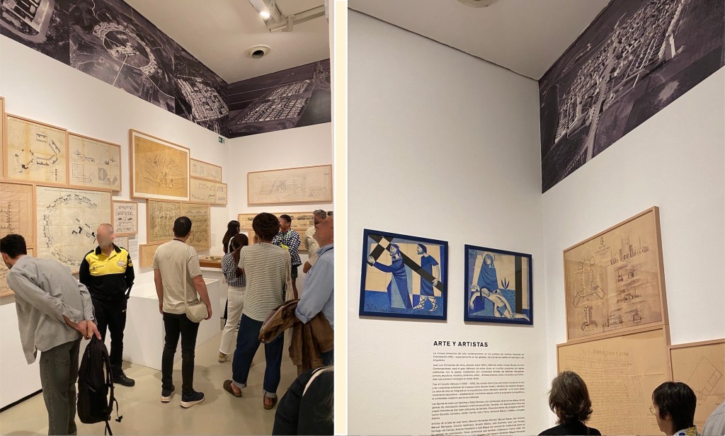 Paso a comentar aspectos puntuales. En términos generales, la primera sección muestra la dimensión arquitectónica y urbanística en algunos de los más de 300 pueblos construidos. La documentación gráfica elaborada por aquellos arquitectos que los diseñaron es abundantísima. Seleccionar qué mostrar ha debido de ser complicado, dada la calidad e interés de la mayoría de los proyectos. Se ha tenido que acotar mucho, pero, aún así, lo seleccionado es excesivo para el espacio reservado a esta sección o, mejor dicho, casi inútil. La disposición de los planos en conjuntos de mosaicos sobre los muros funciona bien como unidades compositivas, pero los dibujos situados a más de 180 cm del suelo no se pueden ver con claridad al quedar muy por encima de las cabezas de los visitantes, máxime si se tiene en cuenta que los detalles dibujados (la mayoría de lo plasmado) son pequeños. Ni qué decir tiene que el friso fotográfico, en el encuentro de muro y techo, ocupa una posición aún más distante. Sólo lo arquitectónico y urbanístico habría constituido, sin más añadiduras, una exposición en todo el espacio de ICO con una disposición más cómoda y legible, organizada por tipologías edificatorias: viviendas para agricultores y para obreros, Iglesias, casas consistoriales e institucionales, escuelas, cines, parques y fuentes ornamentales…