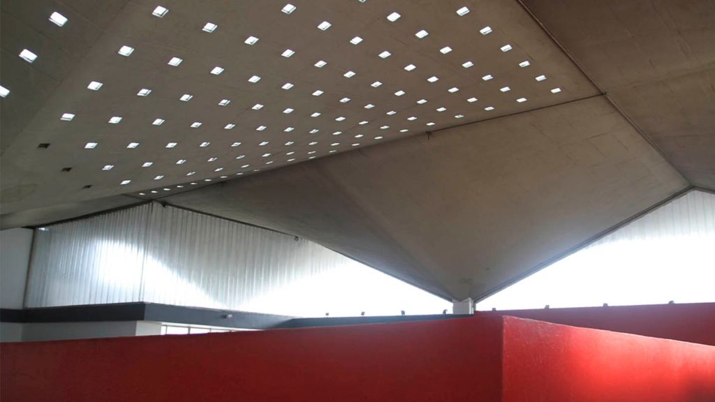 Lo que veo lo más cercano a lo escénico-musical en la trayectoria conjunta de Sosa Díaz-Saavedra y Alonso Rohner -desde 2011- es la reforma de un edificio, La Loza, levantado en 1961 como almacén de loza y que llevaba treinta años abandonado. Se reconvirtió para usos múltiples entre los que, según deduzco, se encuentran la música, la danza, las representaciones, los foros… La intervención tuvo lugar en 2020 en un edificio-almacén en el polígono industrial Miller Bajo, en Las Palmas de Gran Canaria, un polígono en el que se concentran muchos pabellones dedicados a la distribución, la venta, el almacenamiento y el arreglo de automóviles y motos; de hecho, antes de convertirse en usos múltiples funcionó durante un tiempo como concesionario de la surcoreana Hyundai y la japonesa Honda. Su estructura ofrecía la ventaja de ser muy regular en la disposición de sus pilares, de manera que, una vez eliminados los tabiques y múltiples añadidos, quedaba una estructura hipóstila casi perfecta que se conservó por razones de sostenibilidad, como una condición del proyecto. Desmontar, limpiar y eliminar enfoscados viejos (salvo en algunos puntos) condujo al edificio a un nuevo punto cero a partir del cual iniciar su rehabilitación para otros usos; y esto se hizo evitando divisiones, dejando libre la retícula de pilares, generando un espacio pautado para conseguir una organización abierta y con aire de cierta provisionalidad. La intervención dejó desnuda la estructura original, de luces relativamente cortas en una malla de ocho por cinco, pilares esbeltos y vigas de canto. A esta retícula se le añadieron elementos que potencian su efecto diáfano y la amplitud visual. Las divisiones onduladas de policarbonato traslúcido contrastan con la estructura de hormigón existente. Los cubículos que contienen los despachos están distribuidos a lo largo de la planta, cuya diafanidad se interrumpe con patios por los que accede la luz solar. La retícula de pilares, una vez limpia, se convirtió en una especie de partitura en blanco -un espacio pautado– donde anotar los elementos que organizan el programa, puntuando el espacio como hacen las notas sobre el pentagrama.