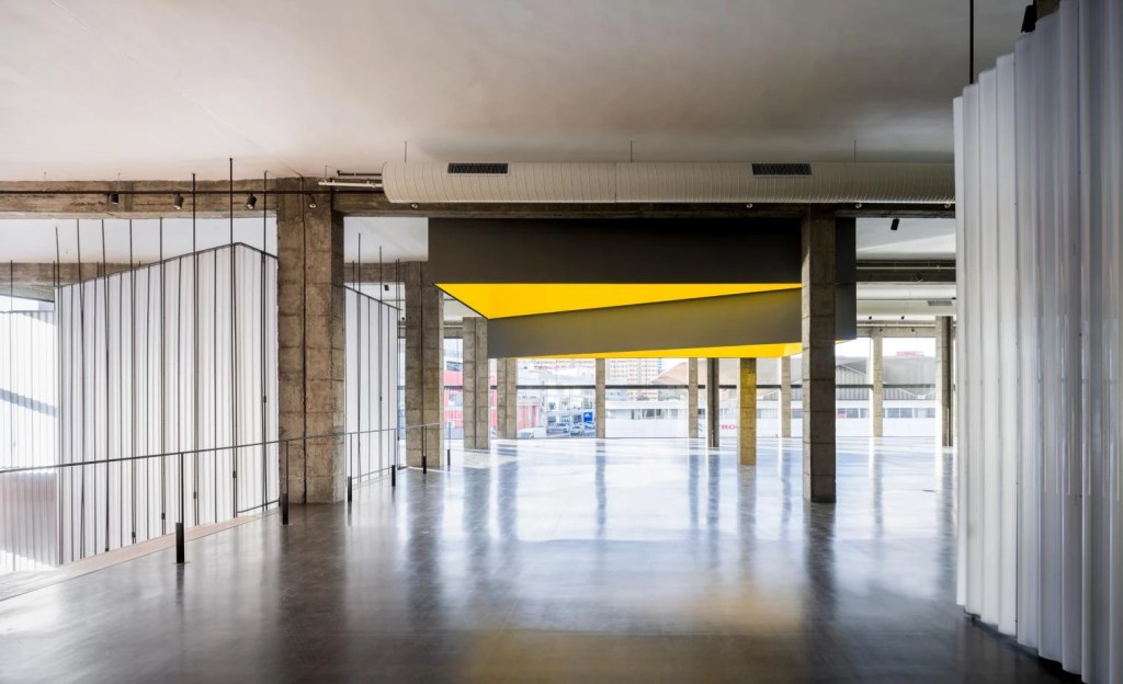 El trabajo fue Finalista premios FAD 2021, Finalista premios S. Arch 2022, Premio MMFT Mejor Obra 2022 y Premio MMFT Rehabilitación y Restauración 2022. No diría que ésta fue una restauración de un viejo edificio industrial, sino más bien la reutilización de su estructura portante de hormigón. En todo caso, los arquitectos tuvieron la sensibilidad de dejar enfáticamente visible esa estructura tanto en su perímetro como en el interior, utilizando su disposición reticular para ordenar el espacio sin enmascaramientos.
