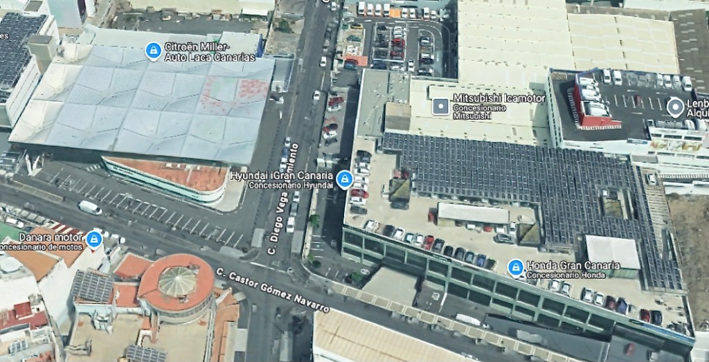 A la izquierda de la calle Diego Vega Sarmiento, cubierta de paraboloides hiperbólicos de Luis López Díaz; a la derecha, edificio La Loza cuando era un concesionario de Hyundai y Honda.