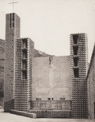 Base de la torre de campanario en la basílica de Arantzazu (1950-55) y vista parcial del Swiss Army Pavillion, Lausana (1963-64).