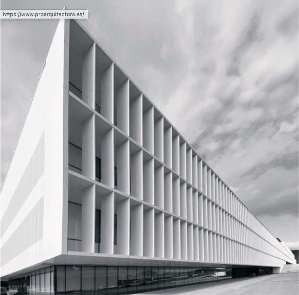 El alargado bloque de Faes Farma se encuentra en el punto más elevado de la ladera ocupada por el Parque y tiene 400 metros de anchura frontal (este-oeste) y 120 de fondo (norte-sur), estando fragmentado en tres cuerpos: uno, destinado a oficinas, dirección y 3.000 m2 de laboratorios, se organiza alrededor de dos grandes patios desde los que es posible entrar con contacto visual con el paisaje; los otros dos albergan zonas de producción, área de carga y descarga, almacenaje robotizado y logística. La fachada de doble piel, con lamas de aluminio lacado, conforma una celosía exterior que vuela dos metros por delante del plano de cerramiento del muro cortina de vidrio. La blancura subraya un sobrio lenguaje abstracto -es inevitable decir minimalista- que resulta clave para, aparentemente, aminorar el impacto volumétrico de la construcción, lo cual se consigue al reducir su altura, adaptándose a la orografía de la parcela y a la servidumbre aeronáutica debido a la cercanía del aeropuerto. Esto da lugar a un bloque escalonadamente alargado. Desde un punto lejano del vial de acceso -ascendente y perpendicular a la esquina Oeste de la fachada- aparece el edificio administrativo como si flotara sobre la entrada principal.