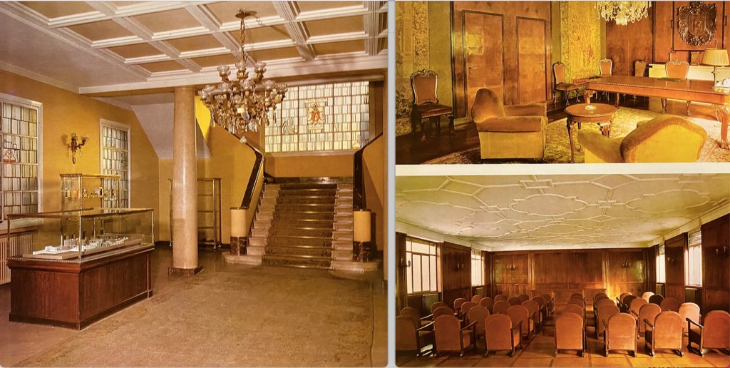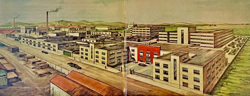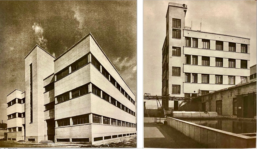 El edificio institucional más representativo y desde el que se gobierna la empresa utiliza un repertorio decorativo atenuadamente historicista con escudos, frontones y columnas alrededor de la puerta de entrada inscrita en el marco de un gran paño de ladrillo rojo. Puro años 40 con puntuales notas palaciegas en los espacios de recepción, administración y dirección (detalles ornamentales de lujo e interiores forrados de madera como evidencias de la jerarquía empresarial) junto a un funcionalismo genérico -una estética del despojamiento- en los demás ámbitos laborales: pabellones de investigación, de producción, de molienda, liofilización, electrólisis y otras dependencias configuran una pequeña ciudad industrial que el dibujante Gerardo D’Abraira se encargó de plasmar en 1942 mediante una de sus maravillosas vistas panorámicas aéreas que la empresa mostró con orgullo en sus primeras publicaciones.