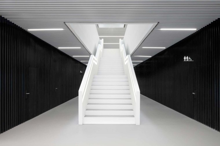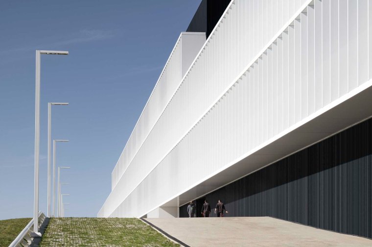 Y, por supuesto, también es importante la imagen que la empresa proyecta desde su sede e instalaciones productivas. De ahí viene la dominante imagen blanca, un tanto fría y como esterilizada, propia de la asepsia clínica y hospitalaria, que proyecta este volumen. Quiere pasar lo más desapercibido posible y, al saber que no puede lograrlo, busca ser neutro e inexpresivo o expresivo de una manera glacial. Esto tiene la ventaja de alejarle de connotaciones que pudieran ser interpretadas desde diferentes y controvertidos puntos de vista, pero con el inconveniente de hacerle parecer sin alma y generador de una desorientación ensimismada en sus impersonales espacios interiores. Ámbitos como para desconectarse del tiempo y el espacio, aparentando igualitarismo laboral. Impecable en lo formal, puede resultar insípido en lo emocional. Negro en el contacto con la tierra y en la proyección hacia el cielo; blanco flotante en el medio. Con aroma y vibraciones de Severance -no en vano esta serie televisiva se rodó en el complejo Bell Labs Holmdel, en Nueva Jersey, diseñado por Eero Saarinen en 1962-, ¿en quién confiar? ¿en el negro o en el blanco? Tal vez sea en el blanco con la prescripción justa de una dosis de negro anexo para que aquel no ciegue y, así, eludir el ensimismamiento.