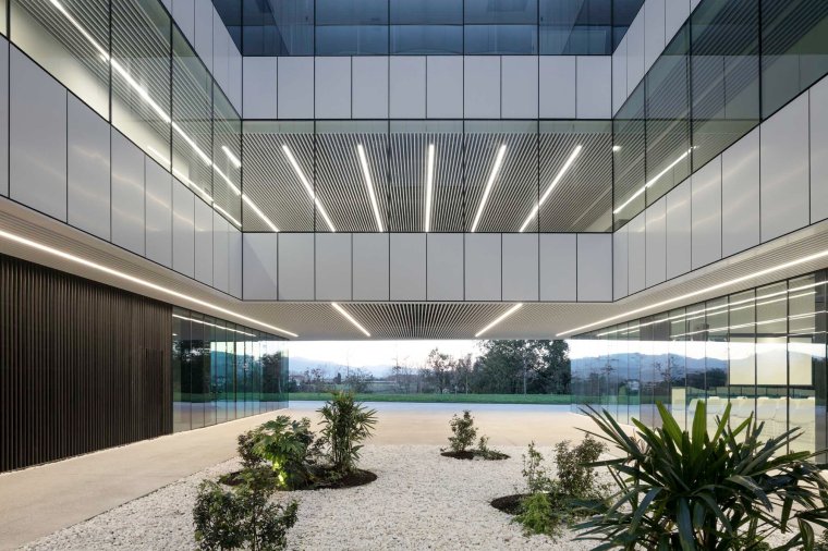 Ochenta años después de levantar las instalaciones en Lamiako, ahora Faes Farma cuenta en Derio con una parcela de 50.000 m2 de los que, utilizando 27.000, ha construido un impactante edificio de 60.000 m2 de superficie útil para lo que hubo de adaptarse a una compleja topografía con pronunciados desniveles que alcanzan en algunos puntos hasta los veinte metros de diferencia entre cotas. Proyectado por IDOM -Gonzalo Carro y Patxi Matute-, en ciertos aspectos recuerda mucho al Instituto BioCruces, en Barakaldo, otro proyecto de IDOM dirigido por Gonzalo Carro hace ya siete-ocho años. Ese recuerdo viene provocado por la retícula de lamas blancas en la fachada -en la que se utiliza el sistema de muro cortina R70ST Riventi– que aporta intimidad y protege de la incidencia directa de la luz solar, dos objetivos que también se han querido para Faes Farma. En ambos lugares, los espacios singulares, como el vestíbulo o la zona de descanso, se abren con grandes ventanales que, si bien en Barakaldo ofrecen una anodina visión urbana y una autovía, demasiado próximas, en Derio revelan el paisaje despejado y luminoso del valle de Asúa. Las diferencias, ocasionadas por el suelo disponible, residen en que mientras en Barakaldo el edificio tuvo que tomar altura y hacerse compacto en Derio se ha podido expandir y escalonar.