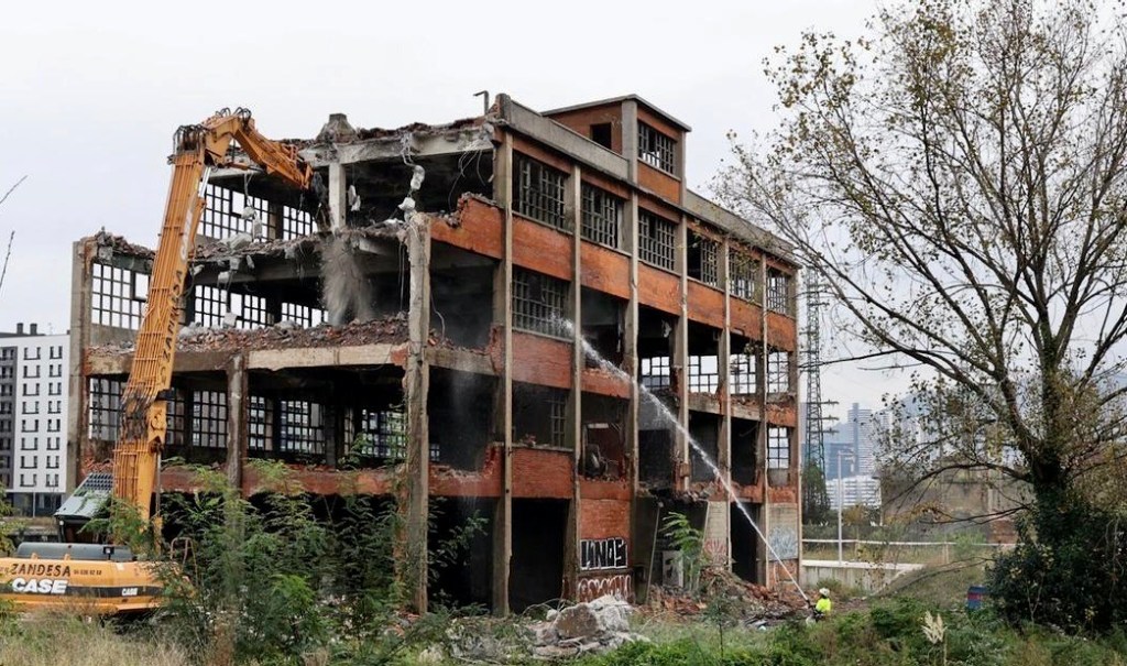 Derribo del pabellón superviviente de la empresa Tarabusi, en Zorrotzaurre, el pasado mes de noviembre. Aunque Tarabusi existía como empresa desde 1940, en 1964 fue cuando se levantó este edificio construido según el proyecto del ingeniero industrial Santos Olaizola. La «isla del talento y la innovación», en vez de aplicar esa inteligencia innovadora a la preservación de nuestra memoria industrial, se sustenta sobre su demolición.