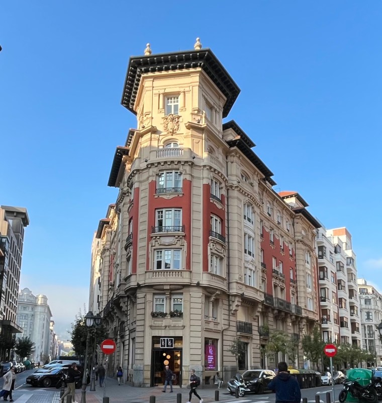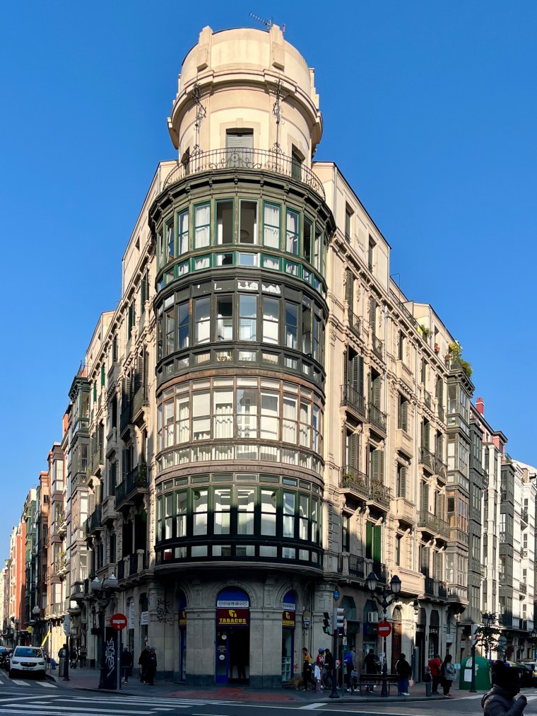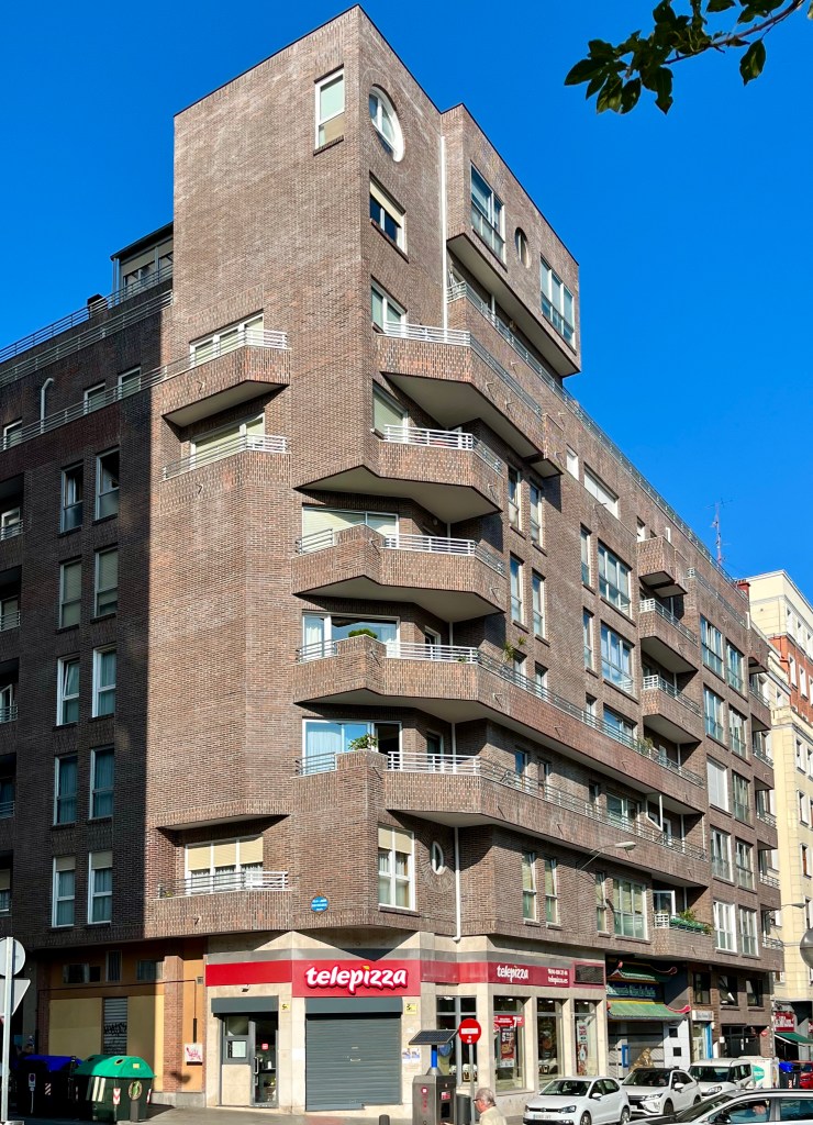 La primera edificación en este emplazamiento correspondía a un inmueble de viviendas con planta baja y cuatro pisos. La esquina entre la Alameda Recalde (pares) y la Plaza estaba achaflanada y, sobre un gran ventanal en arco del primer piso, acogía una fila de miradores, sostenida por dos columnas a los lados del arco, en piedra, recorriendo los tres pisos superiores; dos huecos se abrían en la fachada a la plaza y otros tres lo hacían hacia la calle; otra fila de miradores cerraba el extremo, colindando con el edificio modernista promovido por Pedro Montero. El primer piso mostraba aspecto de ser subsidiario de los comercios situados en planta baja, mientras los tres superiores, residenciales, ofrecían una importancia jerarquizada: el segundo, el llamado también principal, mostraba destacados balcones corridos de piedra y sostenidos por poderosas ménsulas; el tercer piso individualizada los balcones en hierro; el cuarto piso volvía a los balcones corridos en hierro, pero con una altura más baja para el interior de la planta. Unas pilastras gruesas de orden gigante recorrían las fachadas a lo largo del segundo y tercer piso; otras pilastras más planas y cortas decoraban las fachadas a la altura de la cuarta planta. Las plantas baja y primera estaban decoradas por estrías lineales dispuestas horizontalmente, ofreciendo el aspecto de gran base. No he conseguido averiguar el año en que se construyó, aunque lo calculo hacia 1895-97, ni quién fue el arquitecto o maestro de obras que lo diseñó. Fue derribado en septiembre-octubre de 1970.