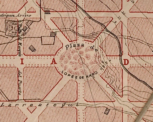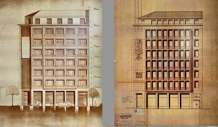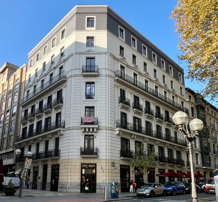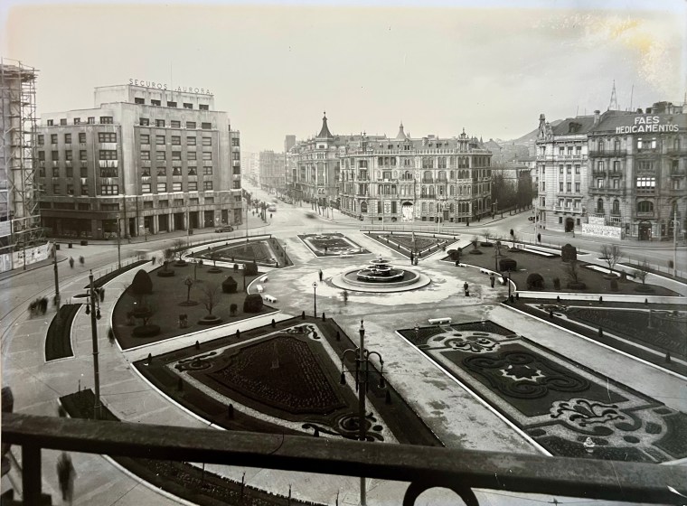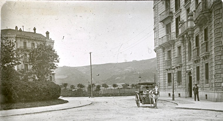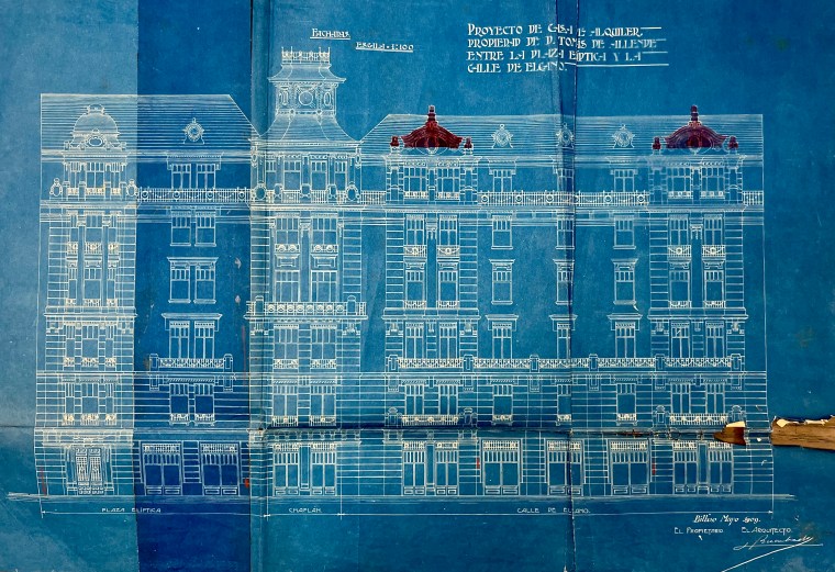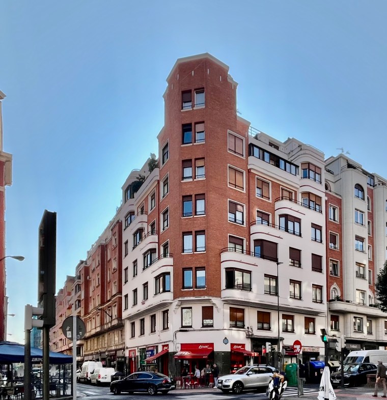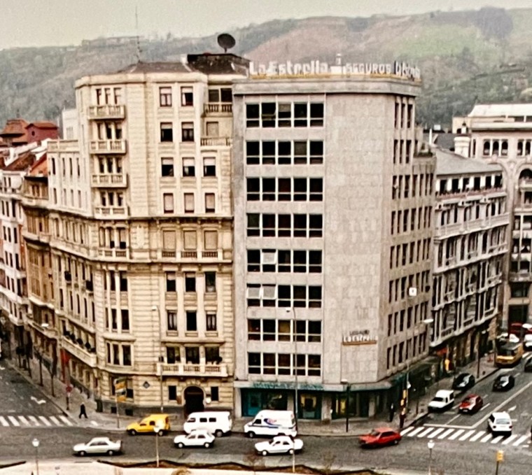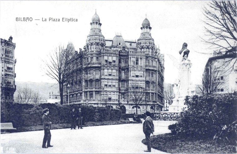 En la fotografía de la izquierda se ve el edificio sin que el solar a su lado en la Plaza Elíptica esté aún ocupado, gracias a lo cual se puede contemplar, al fondo, la iglesia de San José con su torre en construcción, a punto de terminarse, así que la foto debió de ser tomada hacia 1915-16. Las obras del edificio blanco, a la izquierda, dieron comienzo en 1916 con un diseño del arquitecto José Santos Bilbao Lopategui; su quinta planta fue reformada y se le añadieron las plantas sexta, séptima y octava en 1967, lo que no supuso la desaparición del edificio, pero sí una importante alteración de su imagen.