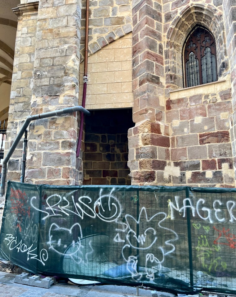 Aguirre/Larrea decidieron confiarlo todo a la calidad de los materiales y estos, sobre todo el granito, añadían grisura, frialdad y pesantez al inmueble. Durante el proceso de construcción se planteó un serio problema de asentamiento en los edificios colindantes, que se apoyaban en parte sobre el demolido, además de tener unas bases de asentamiento endebles. Fue esto, quizás, lo que llevó a los arquitectos a centrar toda su atención en los problemas constructivos más que en cuestiones de imagen exterior, las cuales quedaron empobrecidas.