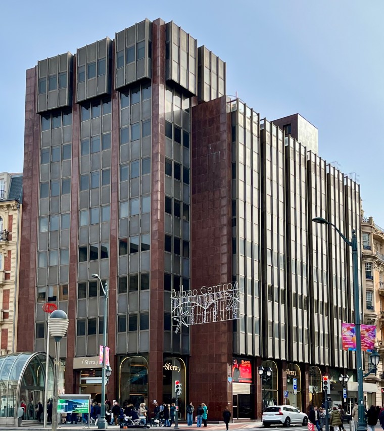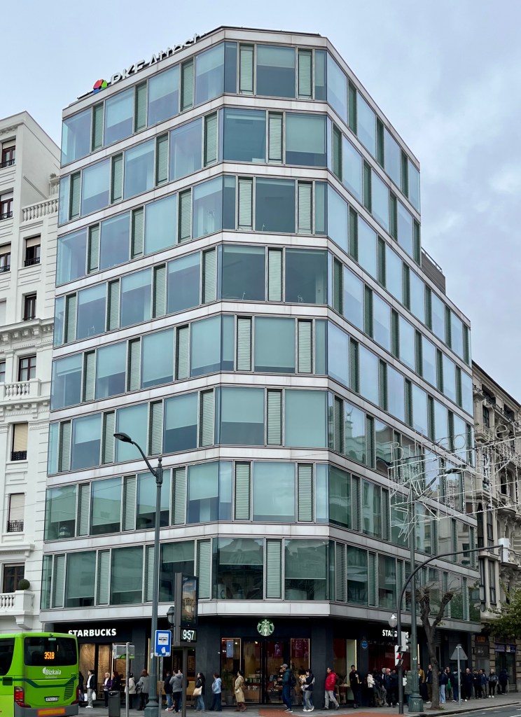 El resultado mejoró sustancialmente el aspecto anterior de esta esquina, al mostrarse más ligera y transparente. Las líneas de separación entre pisos se hallan marcadas por franjas blancas, con la anchura del forjado, mientras el resto de la fachada ofrece un verde acuoso que se aclara u oscurece dependiendo de la posición de los estores interiores. De día el inmueble muestra diáfana actividad y de noche proyecta un festín cromático que, últimamente, parece haberse detenido en la uniformidad azulada. El sistema estaba previsto para que las luces cambiaran con múltiples combinaciones cromáticas y rítmicas, propicias para sumarse a celebraciones callejeras (triunfos deportivos, festividades, homenajes…) con los colores oportunos. Debería recuperarse esa alegría nocturna. Con este edificio la Plaza Elíptica entró en el siglo XXI, sumándose al paisaje de un Bilbao muy distinto al que vio en este solar la primera construcción (el poderío industrial, comercial y financiero) y la segunda (los preámbulos del declive); esta tercera ocasión ha acertado al manifestarse diáfano, alegre y liviano.