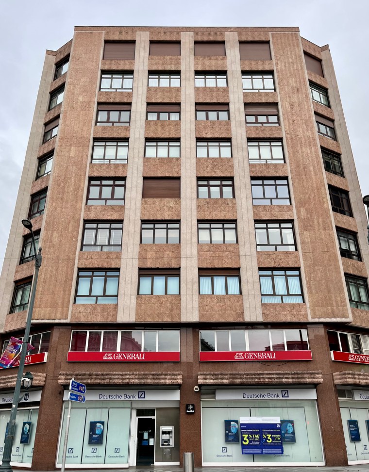 Por fortuna, en el año 2008 el edificio de Larrea/Aguirre sufrió una drástica remodelación de la mano del arquitecto Manuel Salinas Larrumbe. Solo se conservaron los elementos estructurales verticales y horizontales, todo lo demás cambió. La fachada pasó a adoptar una fórmula combinada de superficies acristaladas, tipo muro cortina, y paños de celosía con lamas de cristal más ventana oculta practicable, posibilitando que en el interior sea posible la libre disposición de tabiques para la separación de espacios. Los dos tipos de vanos, cuadrados y rectangulares, se alternan en su despliegue horizontal y vertical, lo que proporciona movimiento al conjunto dentro de un orden impecable.