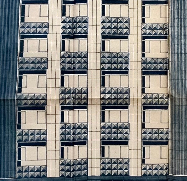 Chaflán ciego y dos fachadas similares con una tajante coronación. La repetición crea un sentido de orden, ritmo y continuidad visual en las fachadas y los espacios interiores, guiando la percepción del espectador.