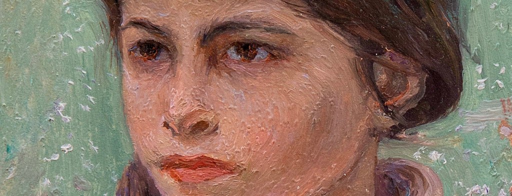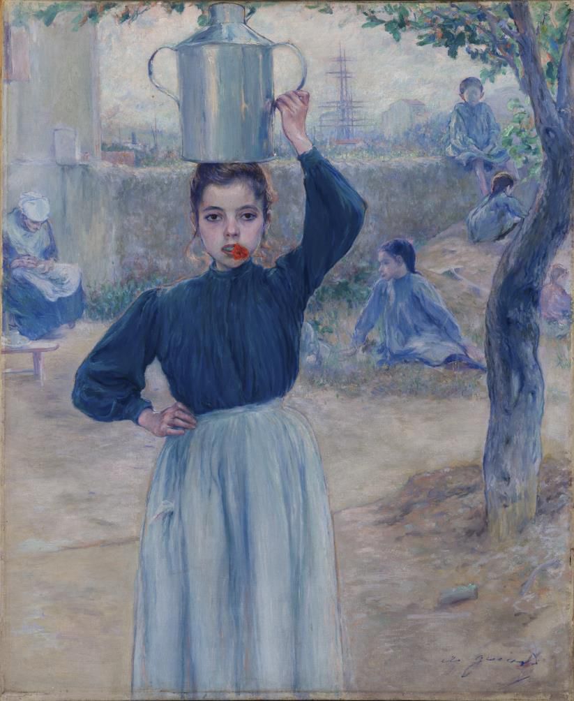 Diez años después de pintar a la niña del peine en mano, instalado ya en Deusto, cerca de la curva de Elorrieta, en un entorno suburbial donde se entremezclaban caseríos, huertas, fábricas, muelles portuarios y viviendas obreras, Guiard encontró esta otra aldeana a la que armonizó cromáticamente en azules, ocres, blancos y verdes, una materialización espacial del color azul, como apuntó Unamuno, y en la que el reflejo dorado del sol en sus cabellos recogidos sobre la nuca juega un discreto papel, casi imperceptible, pero sustancial. Una vez más, una niña y su cabellera. Como sobre esta cantinera, verdadero icono del Bilbao de 1903, ya escribí en otra ocasión, dejo aquí el enlace para quien lo quiera ver.